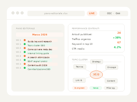 Traccio le performance dei contenuti pubblicati e adatto il piano editoriale in base ai risultati reali, ai segnali degli utenti e ai cambiamenti degli algoritmi di ricerca.