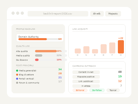 Ogni campagna parte dall’analisi del profilo backlink esistente e dei competitor. Non esiste un approccio standard: la strategia si definisce sui dati reali del sito.