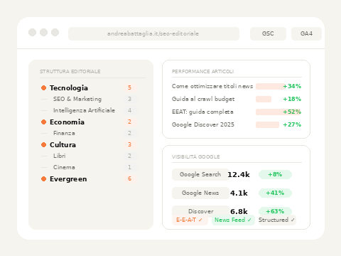 SEO specializzata per siti di notizie, blog e magazine: audit tecnico-editoriale, architettura dei contenuti, Google News e Discover. Per crescita organica stabile e un archivio che vale.
